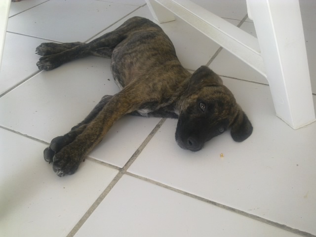 Djaka vond het natuurlijk allemaal maar wát interessant en liet zich uitgebreid aaien, onderzoeken en knuffelen. Vervolgens diende onze 2e gast zich al weer aan; Jos van de hondenschool “Bon Barking” hier op het eiland. Alex heeft bedacht dat Djaka opgeleid gaat worden tot een waak-/politie-/hulphond, dus dat wordt nog wat…. Zeker als je bedenkt dat Djaka Oost-Indisch doof en blind tegelijk lijkt te zijn 😀 ….